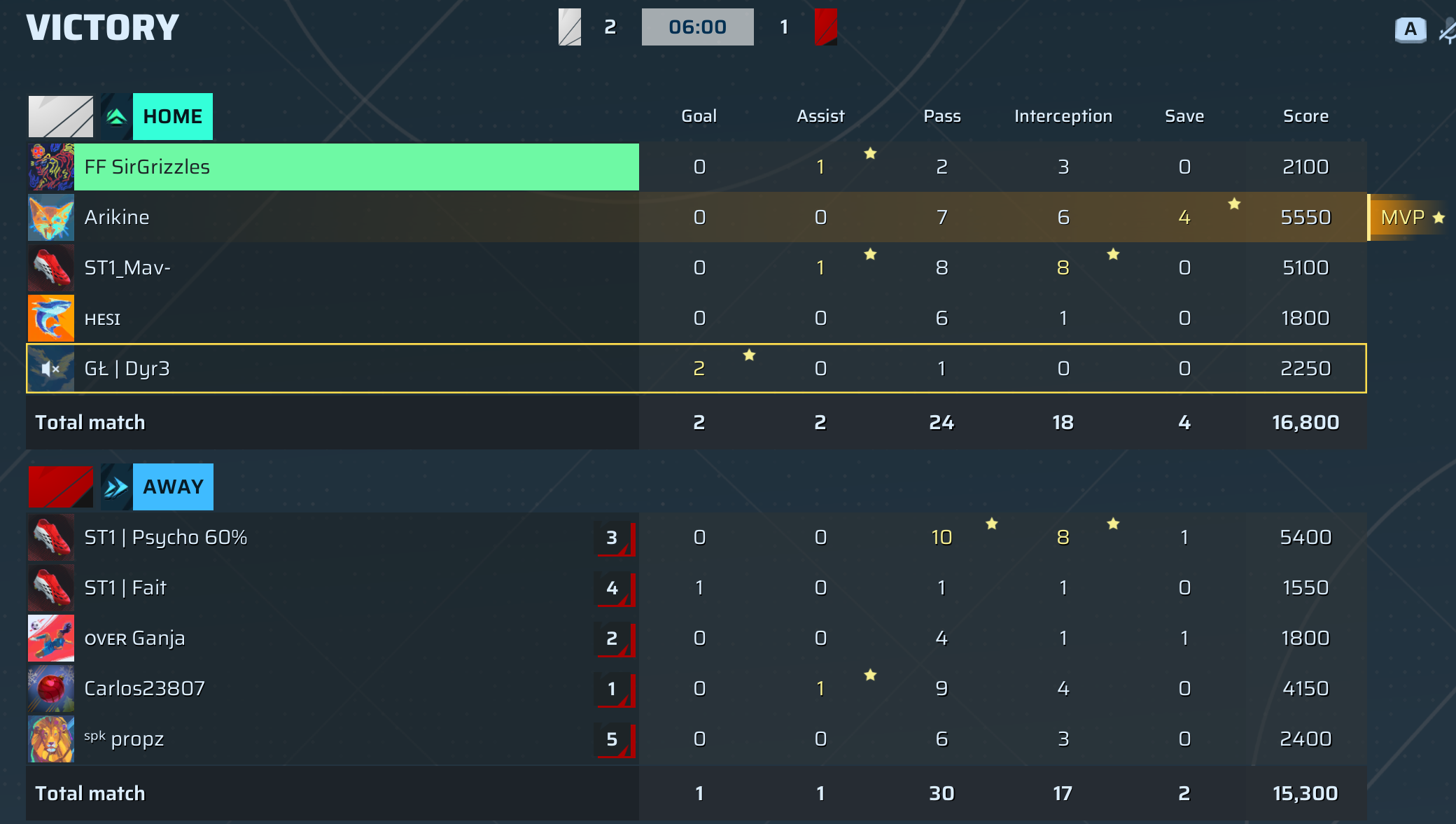 | Player | Goals | Assists | Passes | Interceptions | Saves | Score | Clean Sheet |