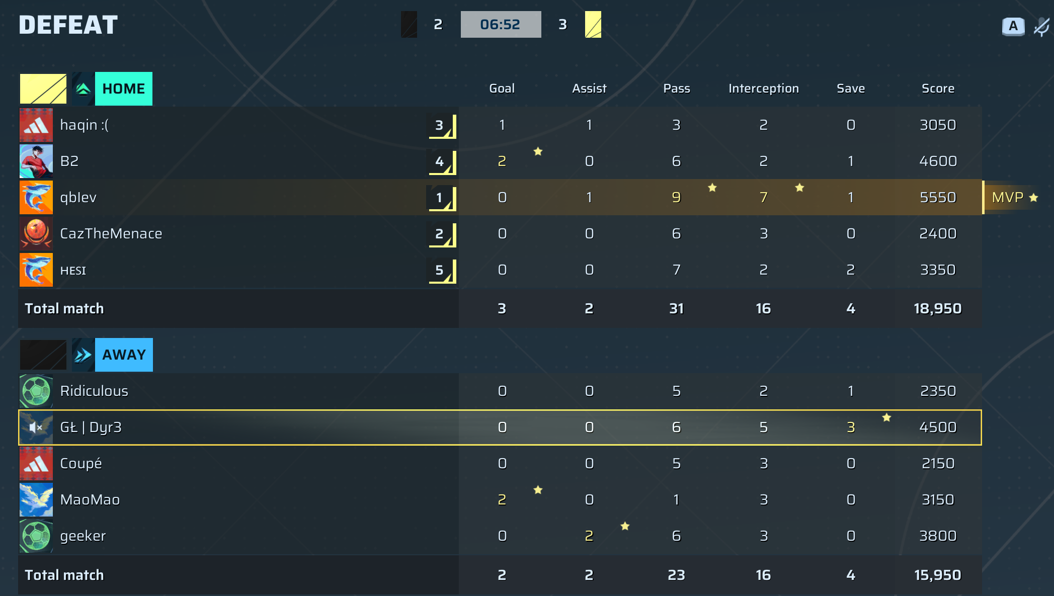 haqin :( Striker | 1 | 1 | 3 | 2 | 0 | 3,050 | — |