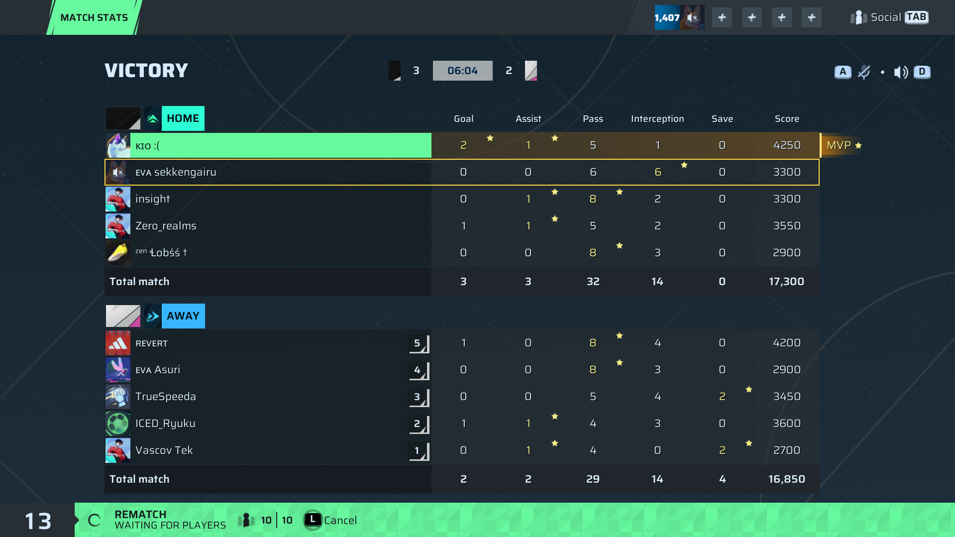 ᴇᴠᴀ sekkengairu Goalkeeper | 0 | 0 | 6 | 6 | 0 | 3,300 | ✗ No |
